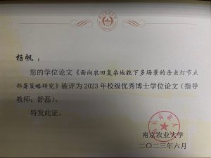 2023年6月实验室2022届博士生杨帆获得“优秀毕业生”称号 2024年4月8日 作者 hutt2022届博士生杨帆获得“优秀毕业生”称号。2023年6月,其学位论文被评为南京农业大学2023年校级优秀博士学位论文。